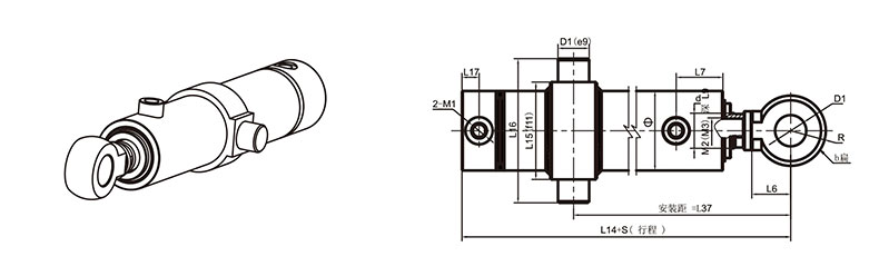 活塞桿端為外螺紋桿頭耳環(huán)連接