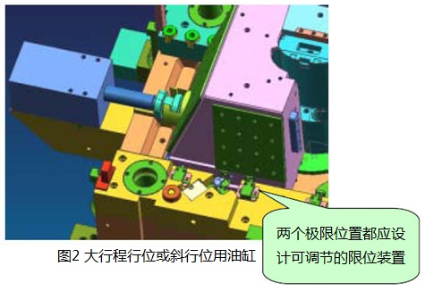 在模具結(jié)構(gòu)中油缸應(yīng)有行程限位控制開(kāi)關(guān),確?;钊讼?;同時(shí)應(yīng)具備模具生產(chǎn)時(shí)自動(dòng)控制所必須的信號(hào)源。