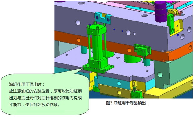 在此類應(yīng)用中,應(yīng)注意油缸的安裝位置,盡可能使油缸頂出力與頂出元件對(duì)頂針組板的作用力構(gòu)成平衡力系,減少頂針組板動(dòng)推板導(dǎo)柱的傾覆力,使頂針組板動(dòng)作順。