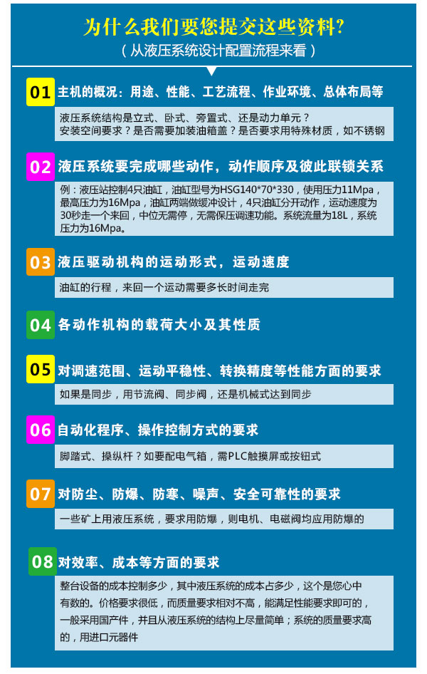 做一臺液壓系統(tǒng)需要客戶提供液壓要達到什么樣的功能要求。液壓系統(tǒng)的整個工作過程。比如一共有幾個油缸或馬達,每個油缸需要達到多少推力,每個油缸的速度是多少是否有變化,以及每個油缸的負載情況。多個油缸時,是否有同時工作或同步要求。(是否變化、還需要提供工作時間、工作環(huán)境)
