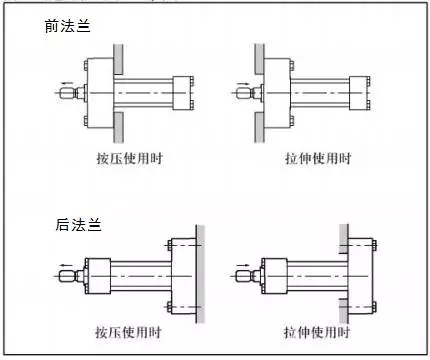 (1)法蘭安裝適合于液壓缸工作過程中固定式安裝,其作用力與支承中心處于同一軸線的工況;其安裝方式選擇位置有端部、中部或尾部三種,如何選擇取決作用于負載的主要作用力對活塞桿造成壓縮(推)應(yīng)力、還是拉伸(拉)應(yīng)力,一般壓縮(推)應(yīng)力采用尾部、中部法蘭安裝,拉伸(拉)應(yīng)力采用端部、中部法蘭安裝,確定采用端部、中部或尾部法蘭安裝需同時結(jié)合系統(tǒng)總體結(jié)構(gòu)設(shè)計要求和長行程壓縮(推)力工況的液壓缸彎曲穩(wěn)定性確定。